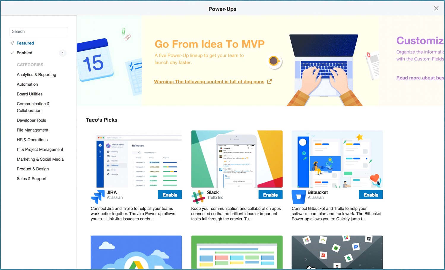While a basic list of extensions worked just fine for a small number of them, it wasn’t an adequate solution for the current list of eighty Power-Ups, Atlassian’s head of platform for Trello Hamid Palo told me. So the team decided to rebuilt the directory to more closely resemble that of a modern app store and that organizes extensions by category.