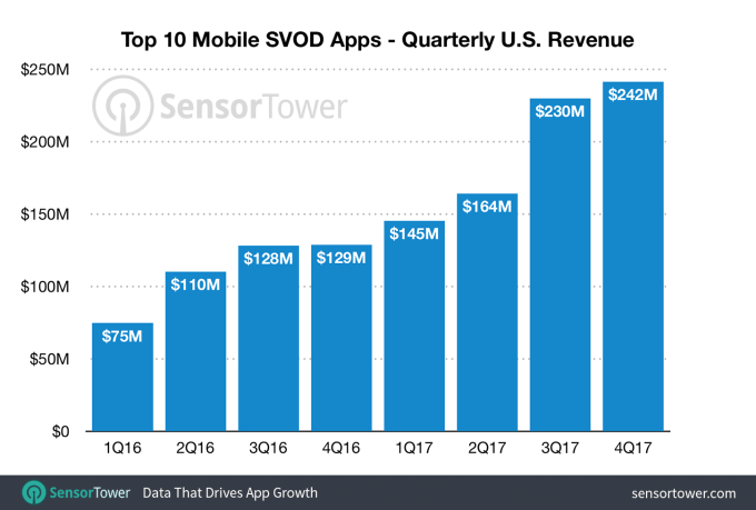 The growth was particularly noticeable in the fourth quarter of 2017, when the top 10 subscription video apps grew 88 percent year-over-year to reach roughly $242 million, up from $129 million in Q4 2016.