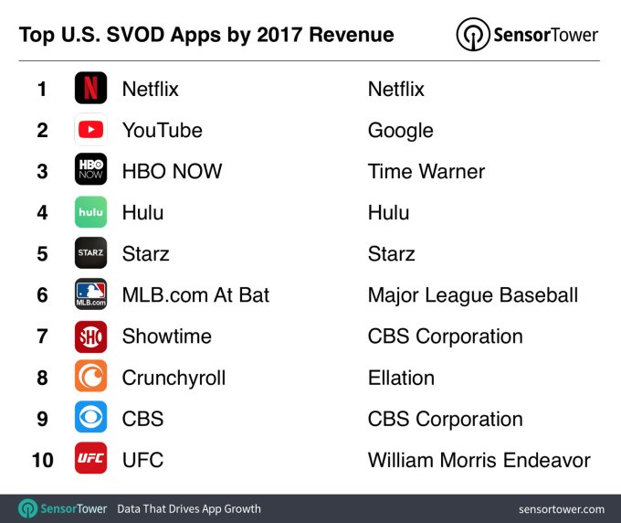 The cord cutting trend is having an outsized impact on subscription video apps’ revenue, it seems. According to a new market analysis from Sensor Tower, U.S. consumer spending in the top 10 subscription video on demand apps grew 77 percent last year, to reach approximately $781 million across the App Store and Google Play.