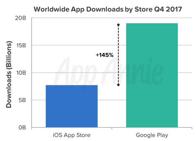 Smartphone adoption in emerging markets just delivered the highest number of app downloads Google Play has ever seen in a quarter. According to today’s report from App Annie, Google Play app downloads topped 19 billion in Q4 2017, a new record. That also makes Google Play’s download lead over iOS its largest ever, at 145 percent.