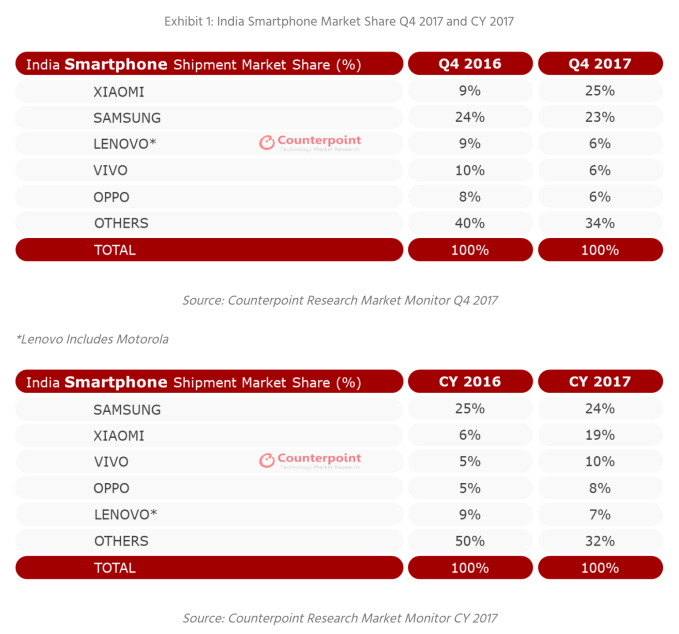 Data from both analyst houses gave Xiaomi a narrow lead over Samsung in the final quarter of 2017, with 27 percent and 25 percent, respectively, according to Canalys — and 25 percent versus 23 percent, according to Counterpoint.