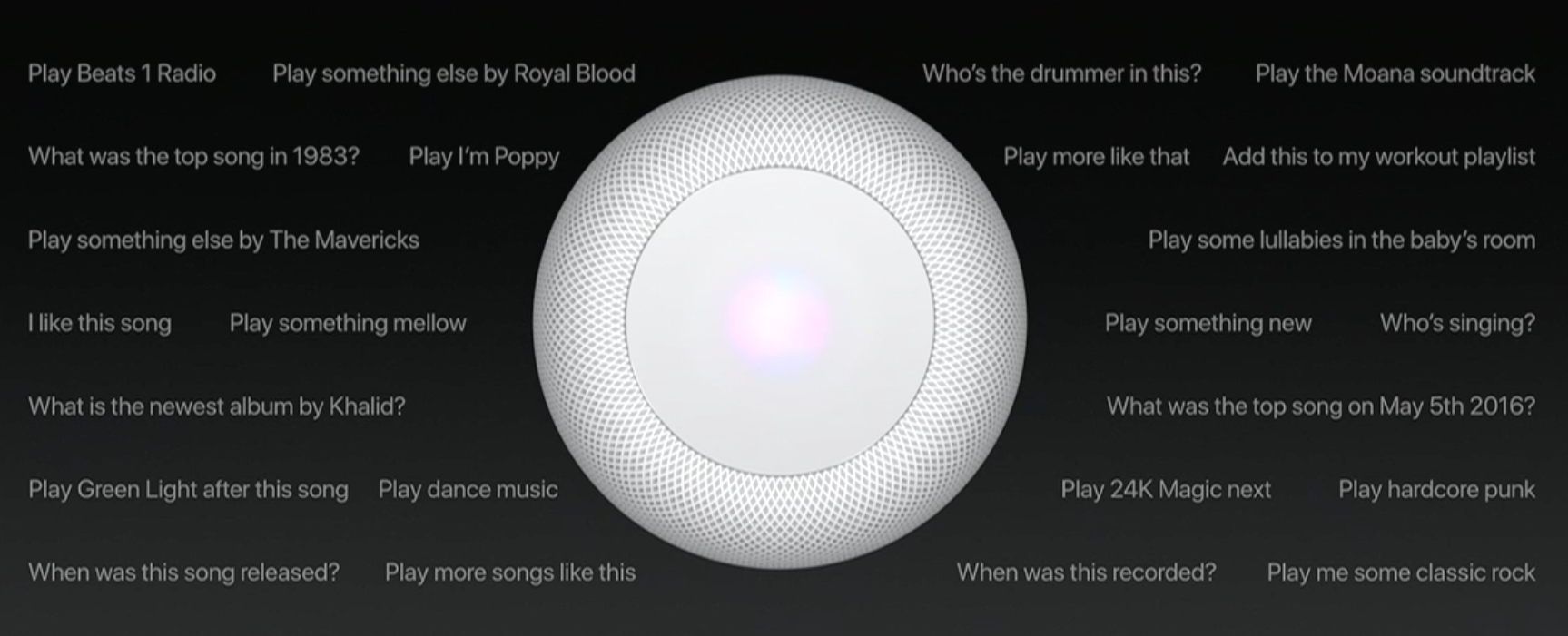 So it sounds great — it’s nice to look at, too, with a cloth cover that comes in either white or a dark gray. The top features two volume touch buttons. When the HomePod is listening and thinking, you get a colorful circle of light representing that ethereal sense of intangibility that is Siri — which, of course, brings us to the other part of the whole smart speaker experience.