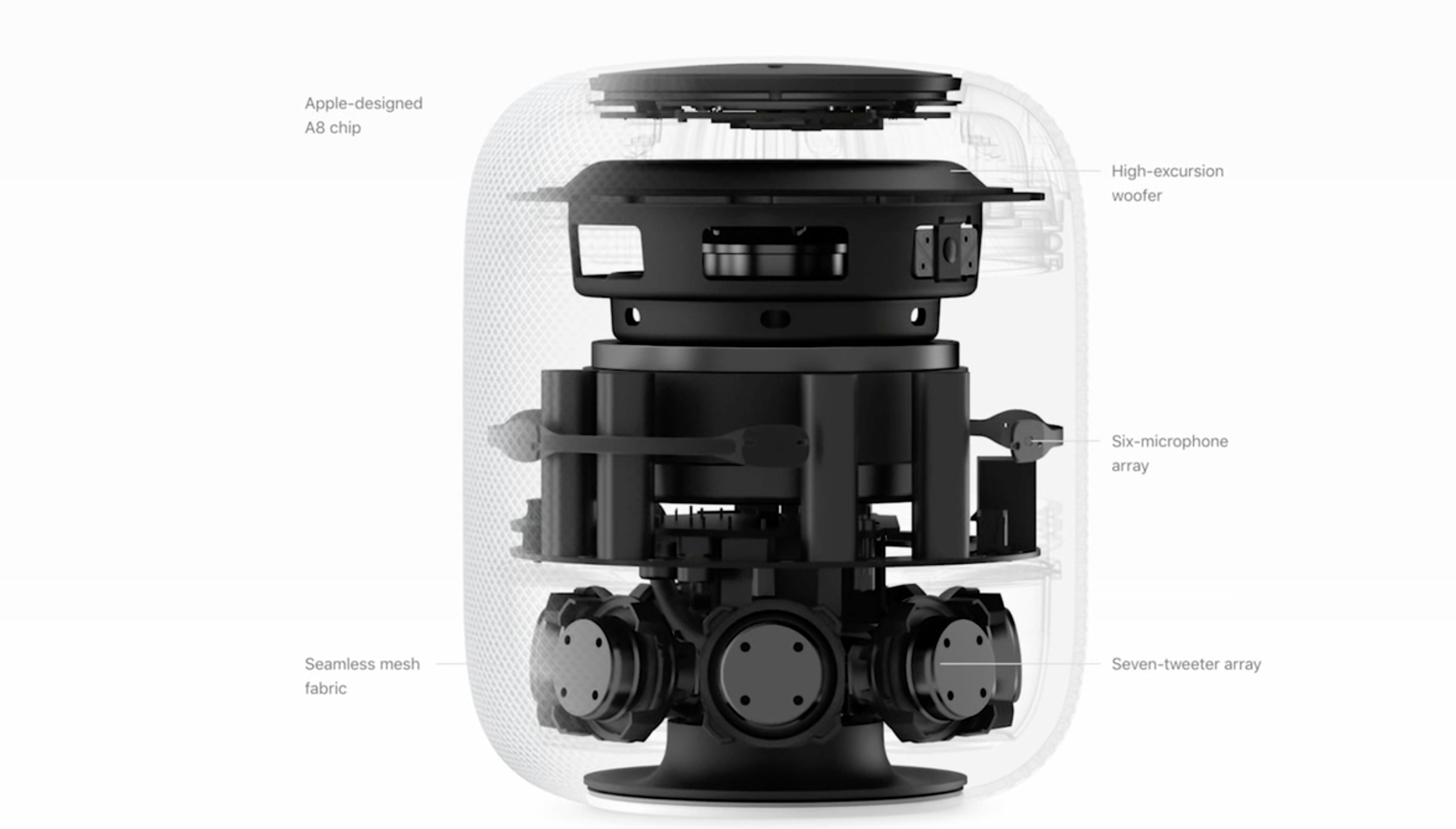 The company diagrammed the internals a bit during launch. There’s a ring of seven tweeters around the bottom of the system, with a large woofer up top — which is able to move up to 22 millimeters, a sizable travel given the HomePod’s relatively small size. One of the big things the design offers over the Home Max specifically is that 360-degree design, which again, does a surprisingly good job offering consistent coverage in different spots of a room.