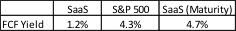 So, no surprise, SaaS companies look quite expensive as compared to the S&P (1.2 percent versus 4.3 percent) as investors get much lower cash flow for a given stock price.