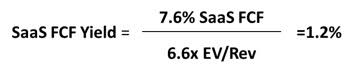So, at face value, how does the free cash flow multiple for SaaS companies compare to the broader market? According to Goldman Sachs, the free cash flow yield (ratio of free cash flow to market cap) for the median S&P 500 company was 4.3 percent as of August 1. So if we use today’s average SaaS revenue multiple (there it is again!) of 6.6x* we can calculate the free cash flow yield for the median SaaS business at 1.2 percent:
