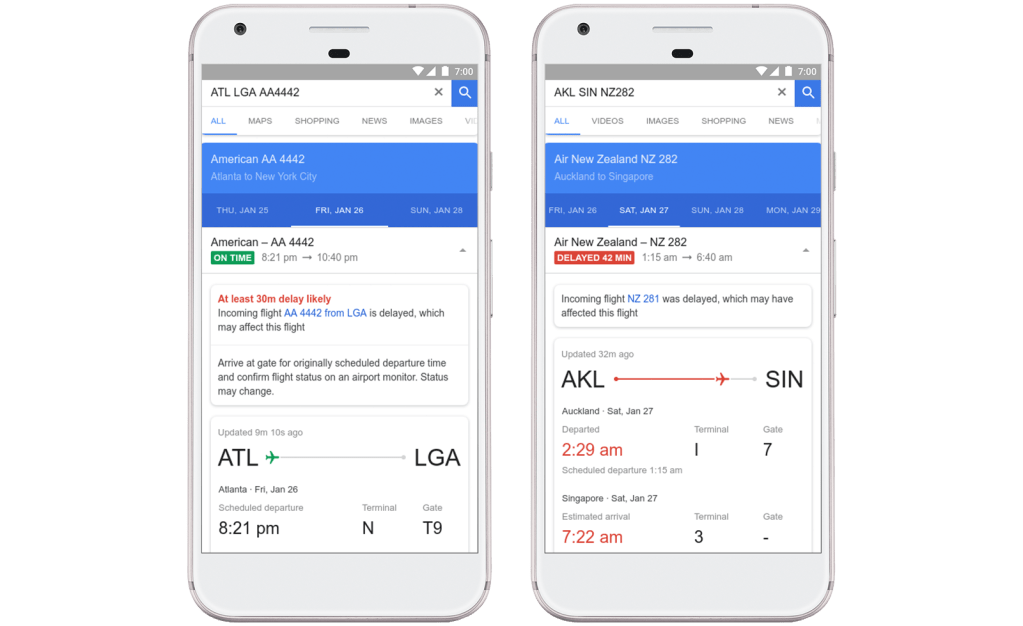 You can track the status of your flight by searching for your flight number or the airline and flight route, notes Google. The delay information will then appear in the search results.