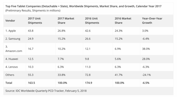 Figures from analyst firm IDC show that overall tablet shipments fell by 6.5 percent to 163.5 million units last year. That’s down from 174.9 million in 2016, when the annual decrease was in double digits.