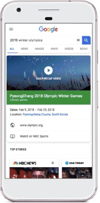 For example, if you search for Winter Olympics, Google will return a list of the various sports as small thumbnails you can click into to get updates – like which athletes won. It will also use your current location to provide updates about your country’s own ranking in terms of medals count, as well as display the top news stories from the Games, and more.