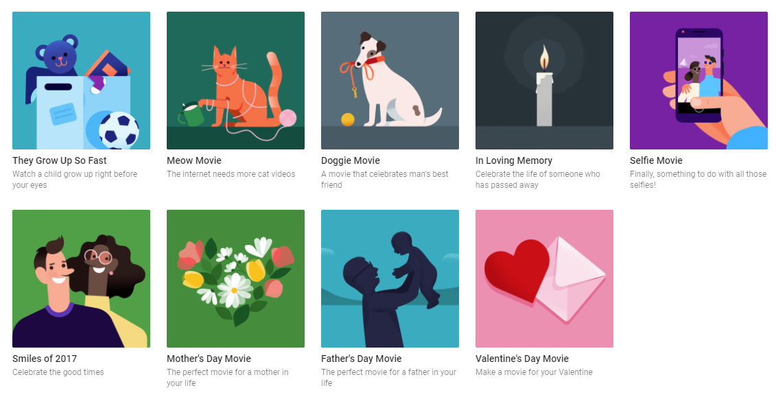 Google says it timed this launch around Valentine’s Day, but that’s only one of the options. The others include movies around your cats and dogs (but not both at the same time), your kids (or those of your friends and family members), a selfie movie, “Smiles of 2017,” Mother’s and Father’s Day movies and, on a sadder note, “In Loving Memory.”