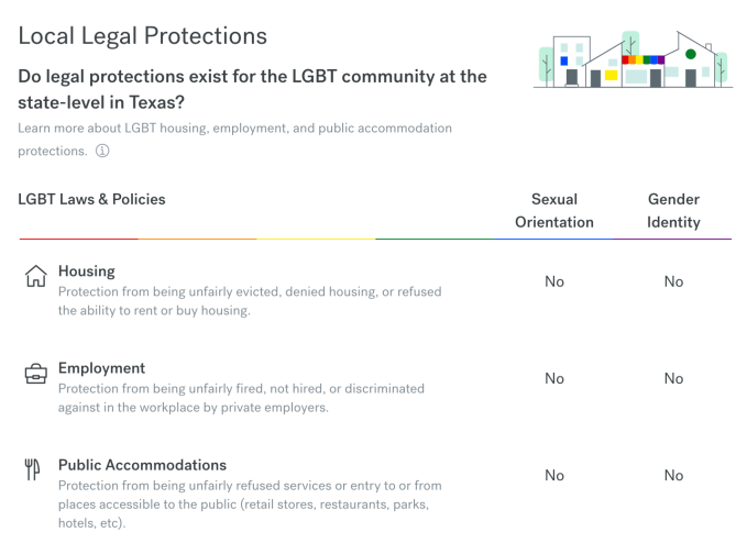 The feature is simple, offering a “yes” or “no” to three sections addressing legal status for LGBTQ people in the area of the listing: Housing, employment and public accommodations. Housing refers to “Protection from being unfairly evicted, denied housing, or refused the ability to rent or buy housing,” while the Employment section addresses local workplace protections (or lack thereof) for LGBTQ workers. The third, Public Accommodations, addresses local laws offering protection from being denied services or entry to public spaces (retail shops, etc.).