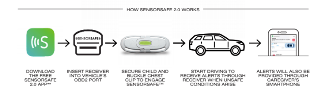 Parents will get an alert in the form of a chime though an installed vehicle receiver if something is wrong while driving — like your child unbuckles their clip. Should the parent not be with the child, they will be sent an alert via the app. So, for example, if someone watching their kid forgets the kid in the car for even a few minutes, the designated emergency contact (usually the primary caregiver) will be alerted on the app and given GPS coordinates to locate the vehicle.
