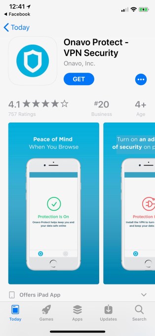 Onavo Protect, the VPN client from the data-security app maker acquired by Facebook back in 2013, has now popped up in the Facebook iOS app itself, under the banner “Protect” in the navigation menu. Clicking through on “Protect” will redirect Facebook users to the “Onavo Protect – VPN Security” app’s listing on the App Store.