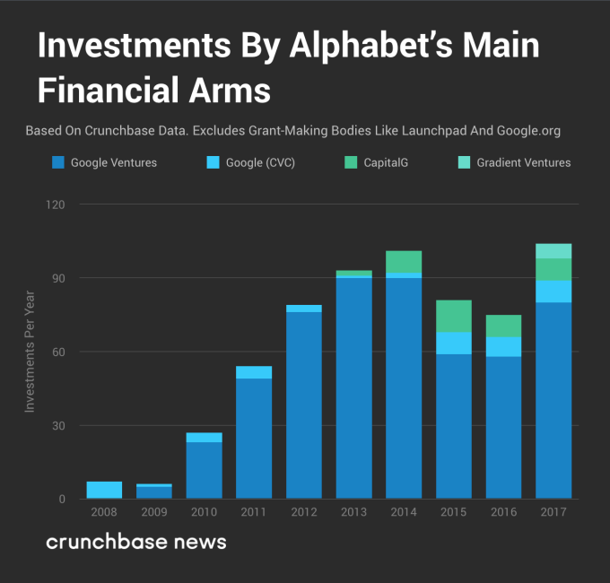 Taken together, Alphabet is one of the most prolific corporate investors in startups. In 2017, Crunchbase data shows that Alphabet’s three main investing arms — GV (formerly known as Google Ventures), CapitalG and Gradient Ventures — and Google itself invested in 103 deals.