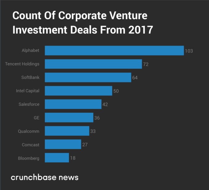 For years, Intel and its venture arm Intel Capital topped the ranks of most active corporate venture investors. But for 2017, Crunchbase data suggests that Alphabet’s primary venture funds unseat the chip manufacturer. With 72 deals struck, Tencent Holdings and its venture affiliates rank second and SoftBank, which has a $100 billion pool of capital to slosh around, comes in third with 64 deals announced in 2017.