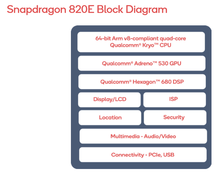 The new Snapdragon 820E platform provides the kind of computing power that you would expect from modern smartphones. Like with its mobile chips, the 800 designation highlights that this is a premium product. Until now, Qualcomm’s embedded systems centered around the 410E and 600E embedded platforms. Those are not going away, but for solutions where computing power at the edge matters, chances are that most developers will now opt for the more powerful and fully featured 820E platform.
