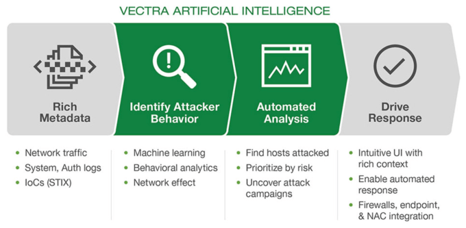 Vectra does this using AI. The thinking here is that, if you are working with large enterprises, there are many places, services, apps and end points that need to be assessed for inconsistencies in how they are being queried and used in the network. Systems that are automated and use machine learning to essentially mimic the behavior of security specialists are the best at doing this kind of searching and identification.