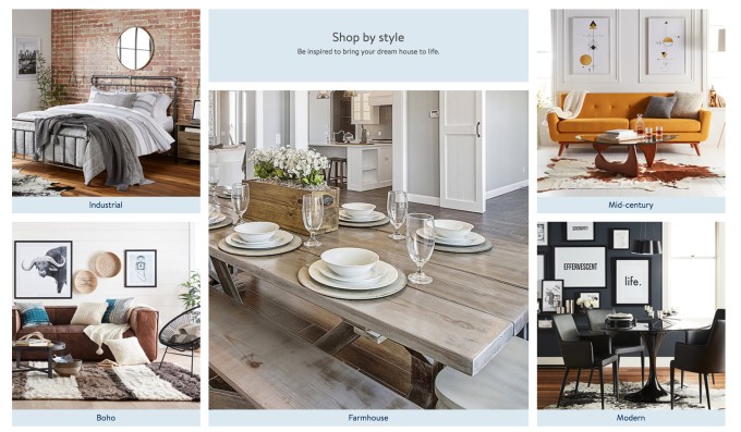 The new site’s home page will feature curated collections across nine style categories, including modern, mid-century, traditional, glam, industrial, bohemian, farmhouse, transitional and Scandinavian. Unlike Walmart’s typical shopping experience, it will also use editorial-style imagery and will include design tips written by in-house staff.