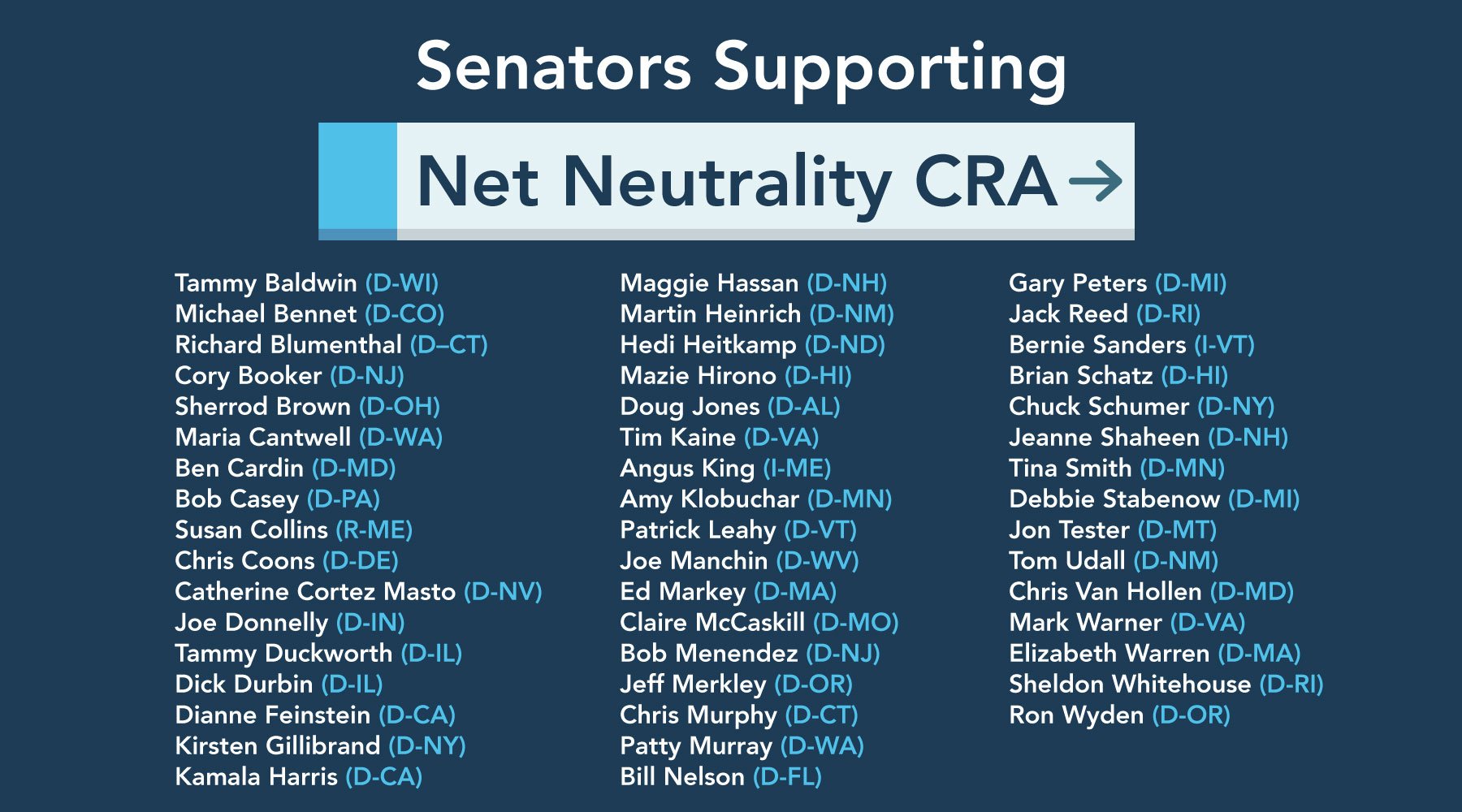 Today, with the entire Senate Democratic caucus, I am officially introducing a CRA – Congressional Review Act – resolution that will *fully* restore #NetNeutrality and we only need #OneMoreVote to pass it in the Senate.