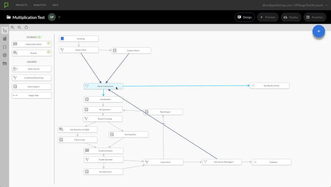 Of course, “let anyone build a voice app” is a description that a number of other companies are today using, when talking about their own web-based, voice app design software. But PullString has a longer history in the business, and has learned about how best to structure conversations to give them a more natural feel thanks to the large-scale projects it’s handled, including those for Barbie, or Activision’s Alexa-enabled speaker “Ghost,” designed for Destiny 2, for instance.