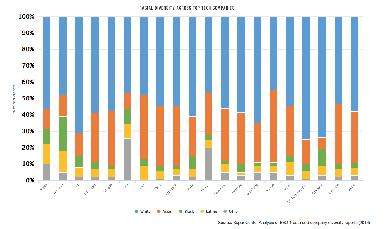 Within the tech workforce itself, which is predominantly white and male, the recruitment and interview processes, workplace culture, biases and harassment all contribute to an overall lack of diversity.