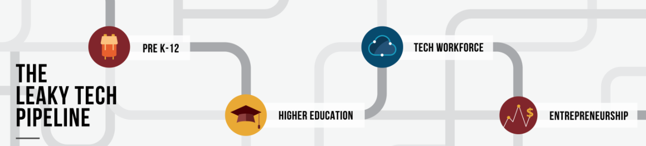 Outlined in The Leaky Tech Pipeline are four key stages of the pipeline: Pre K-12 education, higher education, the tech workforce and entrepreneurship and venture capital. On the website, these four topics are laid out with clear-cut statistics and graphs to help the reader understand the trajectory.