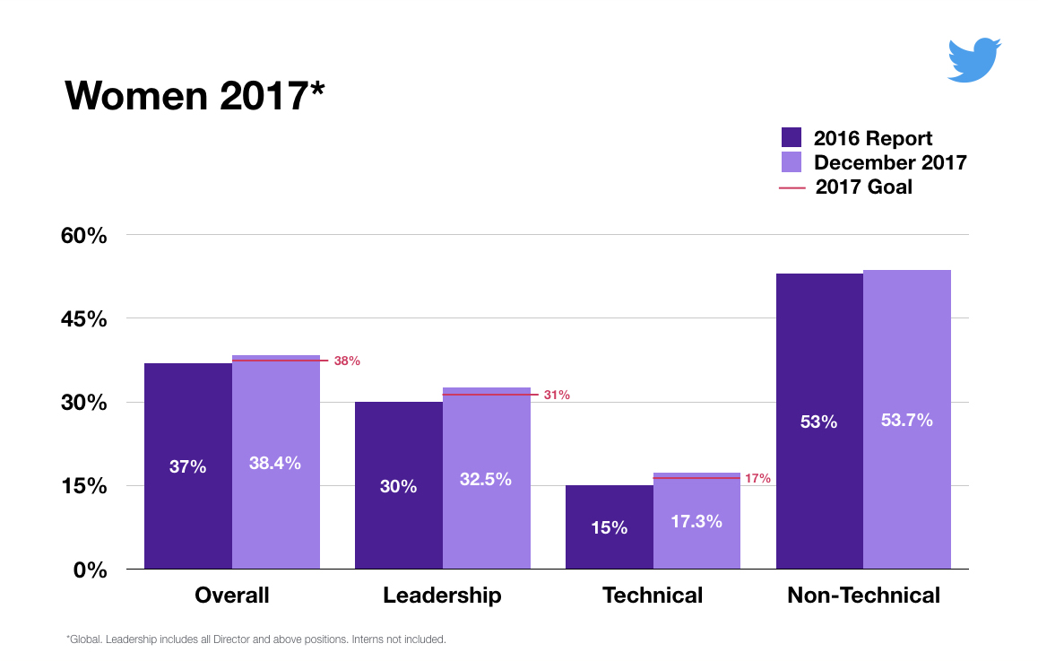 Twitter met or surpassed many of the diversity and inclusion goals it set for itself for 2017, the company announced today. Twitter is now 38.4 percent female, compared to 37 percent in 2016. Regarding underrepresented minorities at Twitter, representation increased from 11 percent in 2016 to 12.5 percent in 2017. Though, Twitter’s process for defining URMs is to include people who declined to self-identify, which is a undoubtedly a weird way to do things.