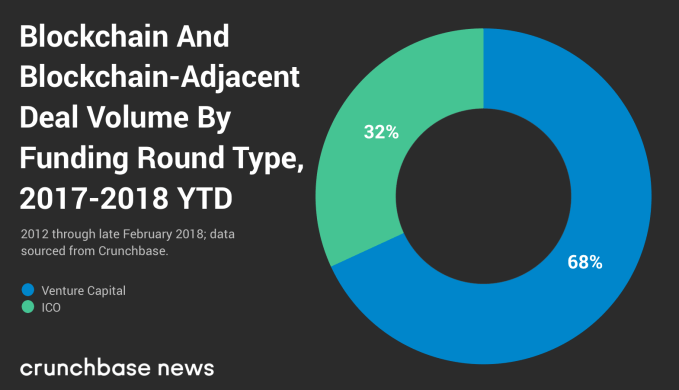 For all of 2017 and the first two months of 2018 at the time of writing, Crunchbase data has captured a total of 527 venture capital rounds and ICOs raised by companies in its bitcoin, ethereum, blockchain, cryptocurrency and virtual currency categories.