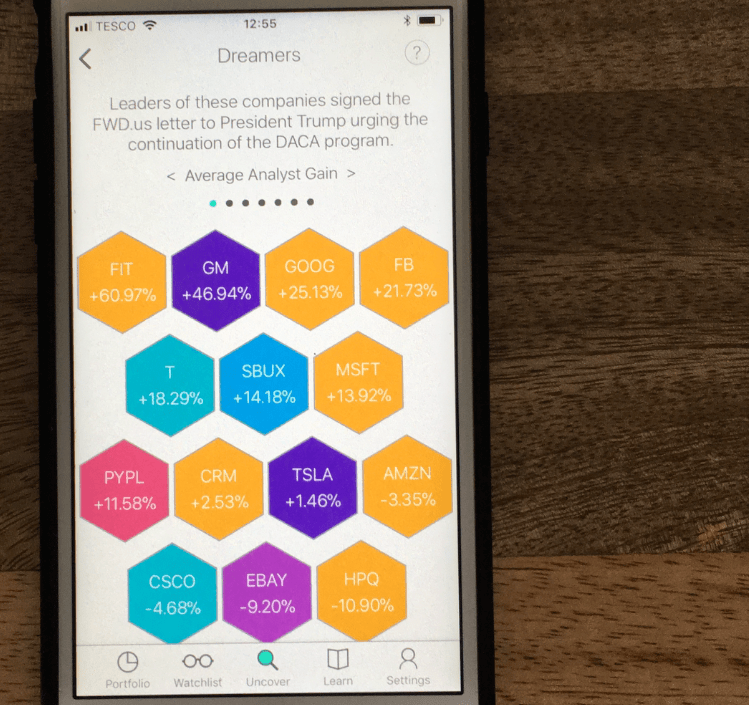 Once you have an idea of a sector or theme you are interested in, you can dig deeper and get average analyst price targets, volatility guidance, and curated insights on the company’s ethical credentials. If you like a company, you have the option to add it to your watchlist or invest directly via connection to your third-party brokerage account. There’s a user-generated content aspect, too.