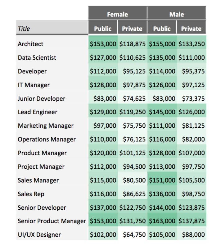 Unsurprisingly, there is a nationwide gender pay gap between men and women working the same jobs. A male senior developer at a public tech company makes an average of $144,000 while a woman working the same job makes an average of $137,000.