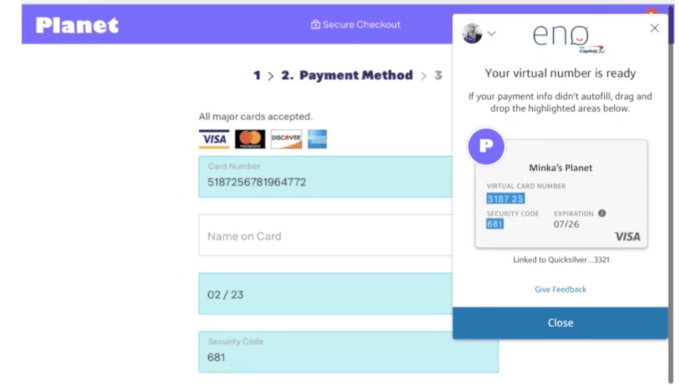 The Eno extension will also auto-fill your payment information on the checkout page, and reappear when you return to the same site in order to provide you with quick access to the virtual card number you created there last time.