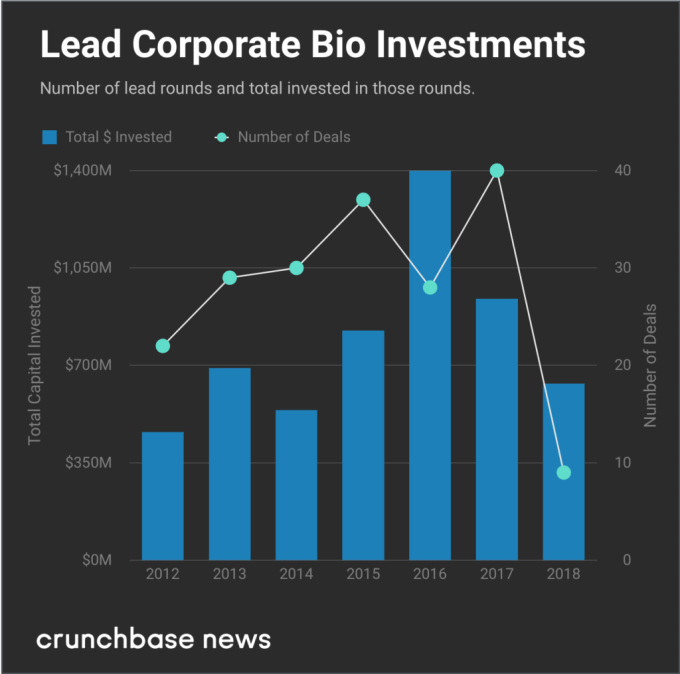 It’s difficult to tell how much a single backer put into a round when there’s a big syndicate of co-investors. That’s why we also looked specifically at deals with a corporate bio VC as lead investor, as it indicates a large stake.