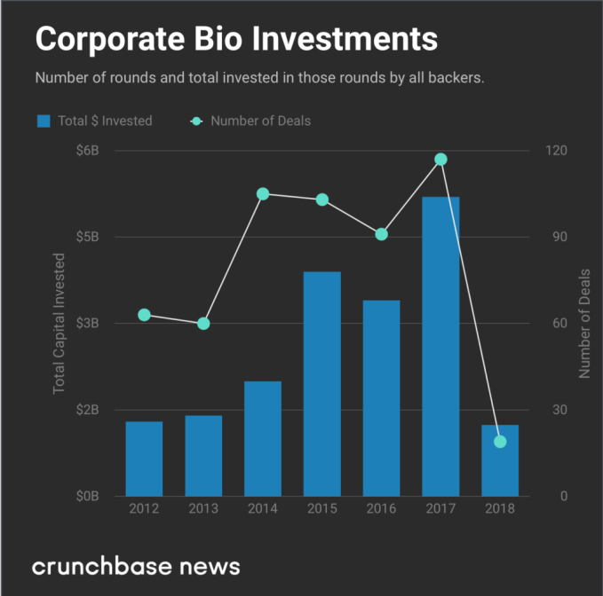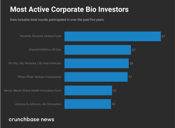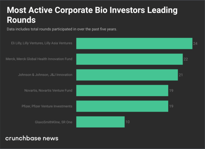 That similarity may be why most of the biggest biotech and pharmaceutical companies have a long history of engaging in the venture business as startup investors, spin-out creators and strategic partners. Since last year, the largest corporate players participated in funding rounds valued at more than $6.4 billion, according to Crunchbase data. Trendlines also show investment is on the rise.