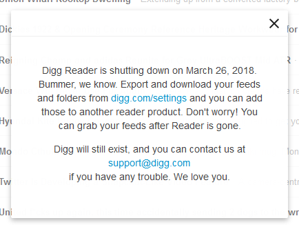 Digg itself will live on, but the Reader portion is being retired. I understand why — RSS readers aren’t exactly glitzy or profitable, they’re more a public service than anything. At some point a company has to reckon with that and decide whether they want to continue subsidizing a tool used by relics like me instead of whatever most people use, probably Twitter or something.