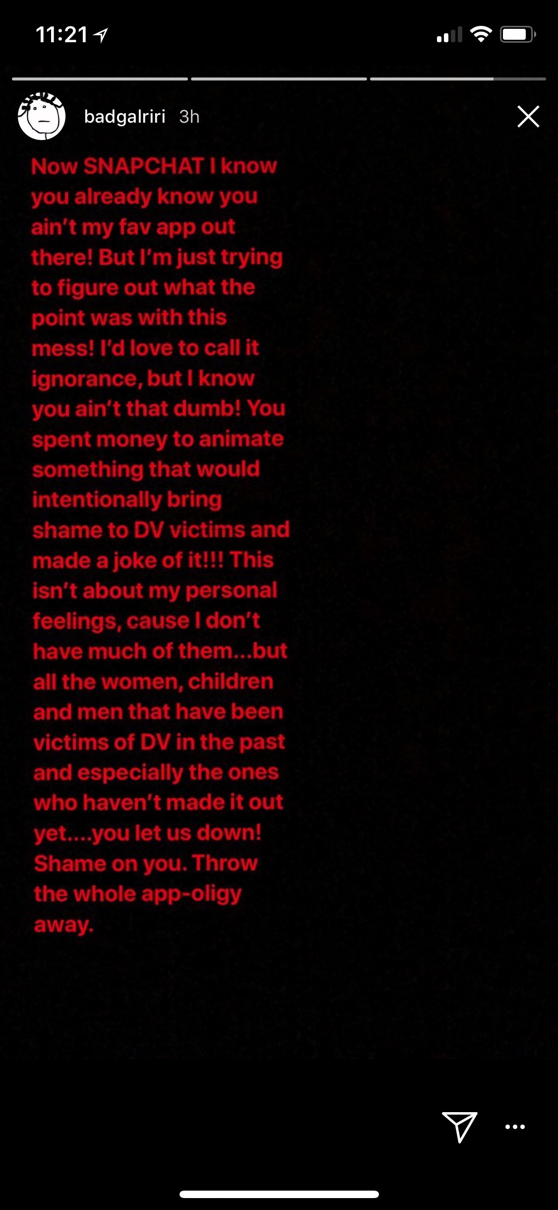 In a statement to TechCrunch, Snap apologized for the ad ever going up in the first place. When directly asked about Rihanna’s message, Snap called the advertisement “disgusting.”