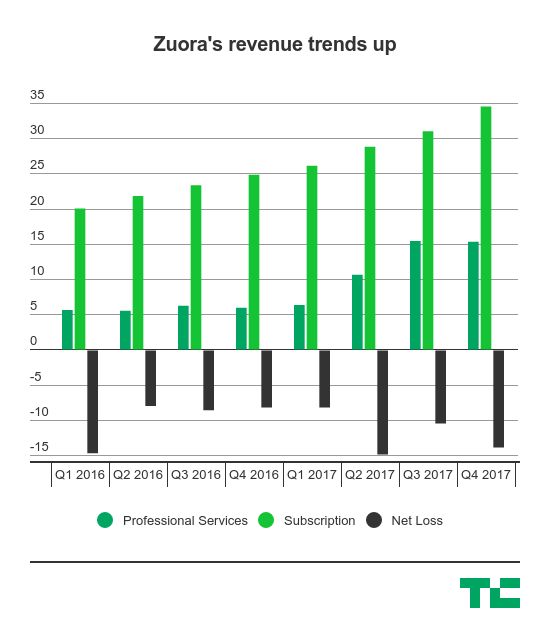 Zuora’s numbers show some revenue growth, with its subscriptions services continue to grow. But its losses are a bit all over the place. While the costs for its subscription revenues is trending up, the costs for its professional services are also increasing dramatically, going from $6.2 million in Q4 2016 to $15.6 million in Q4 2017. The company had nearly $50 million in overall revenue in the fourth quarter last year, up from $30 million in Q4 2016.