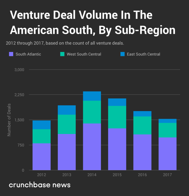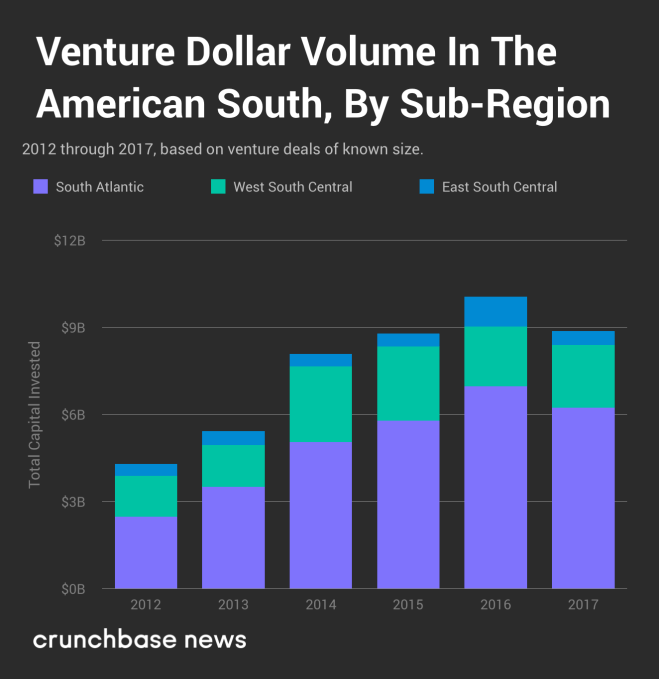 Although it’s not immediately clear just by looking at the chart above, startups in the South Atlantic sub-region have accounted for an increasingly large share of the funding rounds. For example, in 2012, South Atlantic startups attracted 54 percent of the deal volume. In 2017, that grows to 64 percent. Startups in the West South Central sub-region have pretty consistently pulled in between 28 and 30 percent of the deals, so where’s the loss coming from? Startups headquartered in Kentucky, Tennessee, Mississippi and Alabama pulled in just 8 percent of deals in 2017, compared to 18 percent in 2012.