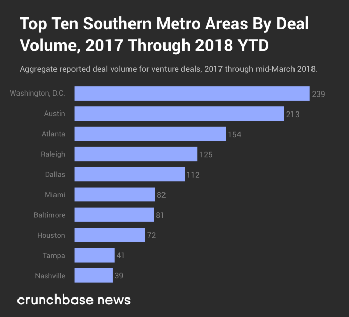 In the chart below, you’ll find the top 10 metropolitan areas where Southern startups closed the most funding rounds.