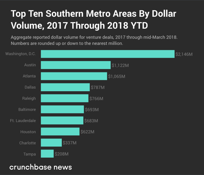 To be frank, Washington, D.C.’s top-shelf ranking was a bit of a surprise. It may be the fact that Austin, TX plays host to South By Southwest, a somewhat more relaxed culture and/or a preponderance of excellent breakfast taco and barbecue joints, but to many — ourselves included — the city feels like it would have a more active startup scene than the nation’s capital. But that’s not exactly the case. The D.C. metro area had more venture deal and dollar volume than Austin for seven out of the last 10 years, and startups based in the nation’s capital have raised more than twice as much money so far in 2018.