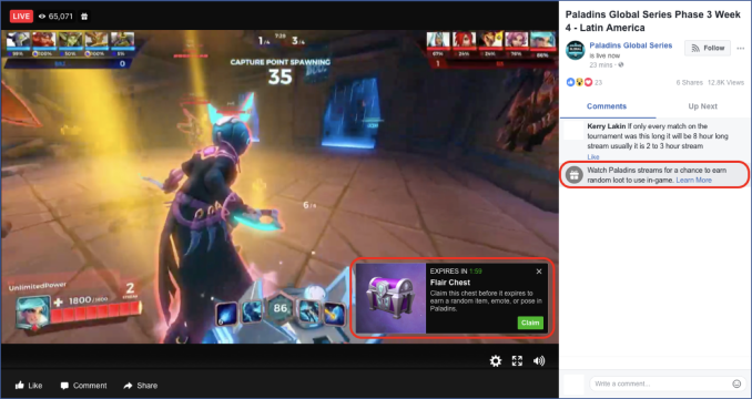 Facebook is challenging Twitch and YouTube for video game live streaming supremacy with the release of its new Games SDK for PC. After testing Live streaming from games like Overwatch from developers like Blizzard since 2016, today Live broadcasting from PC games to the News Feed opens to all developers. And Facebook will let them reward fans who watch by providing in-game items or bonuses. For example, beneath the comments reel, users might see a promotion like “Watch Paladins streams for a chance to earn random loot to use in-game.”