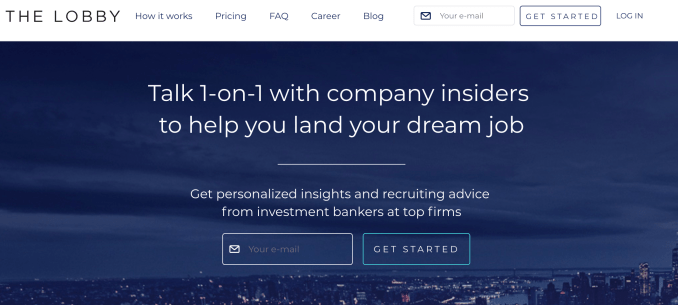 The Lobby helps job applicants secure one-on-one calls with company insiders. With resume critique and mock interviews, the startup helps job seekers get advice “from a real human who has the job they want.” They already work with insiders at top investment banks like J.P. Morgan and Barclays and have a $100,000 gross merchandise volume (GMV) run rate, taking 45% margins on the calls. With 40 million Americans looking for high-skilled jobs, they hope that this is a $2.4 billion market opportunity. The Lobby “turns employes into talent scouts.”