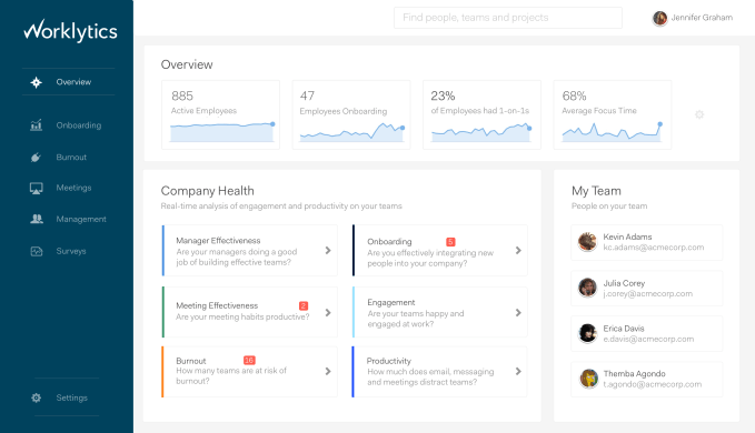 Worklytics wants to get rid of those boring team meetings, and the right place to look is probably at the management layer. The tool keeps track of the kinds of distractions that employees might get, as well as whether the right processes like one-on-one reviews and code collaboration, happen. It doesn’t track specific employees, but it uses the data it gleans from teams to figure out what works best to help companies run more efficiently.