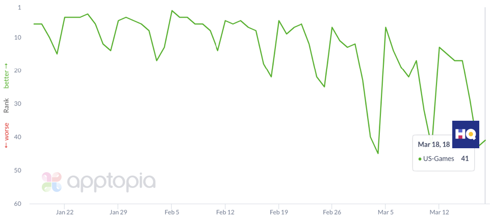 App analytics firm Apptopia confirmed that HQ Trivia was removed from the App Store briefly, and that it has been falling in ranking for the past 30 to 60 days.