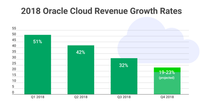 What’s worse is that co-CEO Safra Catz predicted in the earnings call with analysts that the cloud growth could dive even further next quarter. “Cloud revenues including SaaS, PaaS and IaaS [all cloud business combined] are expected to grow 19% to 23% in USD, 17% to 21% in constant currency,” she told analysts this week.