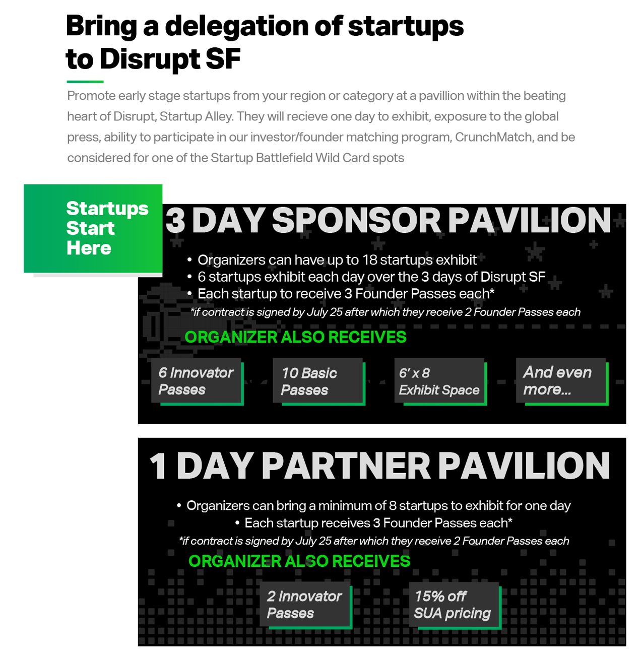 If you want to exhibit in Startup Alley as part of a country pavilion, your delegation startups must meet one low bar: they have to qualify as Pre-Series A companies. If they do, we want to hear from you, so shoot our Startup Alley manager an email at priya@techcrunch.com. Tell us about your delegation and where you’re from, and we’ll provide more information about the application process.