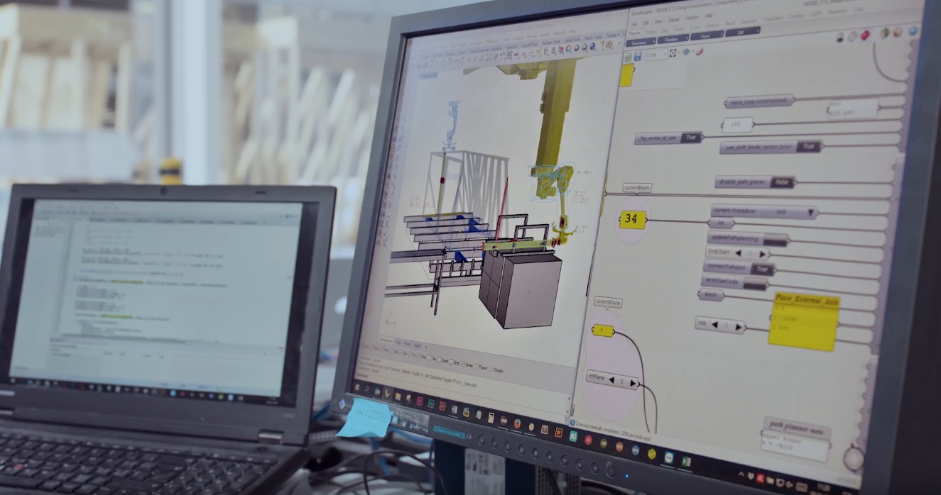 The robot part is as you might expect, though more easily said than created. A pair of ceiling-mounted robot arms in the work area pluck and cut beams to length, put them in position and drill holes where they will later be attached.