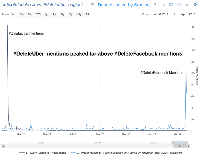 That’s left few places for Facebook haters to migrate. This might explain why despite having so many more users, #DeleteFacebook peaked last week at substantially fewer Twitter mentions than the big #DeleteUber campaign from last January, according to financial data dashboard Sentieo. Lyft’s existence makes #DeleteUber a tenable stance, because you don’t have to change your behavior pattern, just your brand of choice.