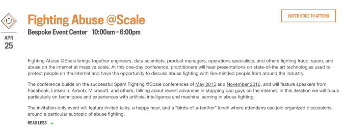 Desperate to show it takes thwarting misinformation, fraud and spam seriously, Facebook just revealed that it’s hosting a private “Fighting Abuse @Scale” invite-only conference in San Francisco on April 25th. Speakers from Facebook, Airbnb, Google, Microsoft and LinkedIn will discuss how to stop fake news, prevent counterfeit account creation, use honeypots to disrupt adversarial infrastructure and how machine learning can be employed to boost platform safety.