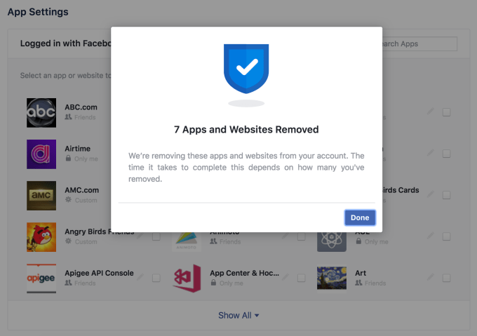 Facebook stopped short of offering a “select all” button so you have to tap each individually. That could prevent more innocent, respectful developers from getting caught up in the dragnet as users panic to prune their app connections. One developer told me they’d been inundated with requests from users to delete their data acquired through Facebook and add other login options, saying that the Cambridge Analytica scandal “really hurt consumer trust for all apps…even the good guys.” The developer chose to change its Terms of Service to make users more comfortable.