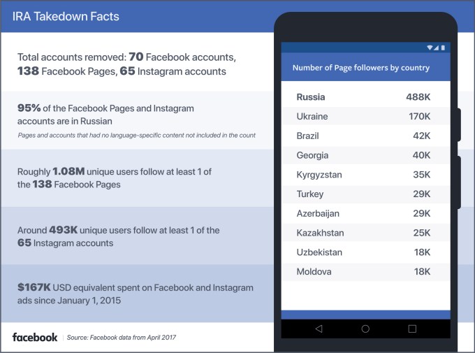 Facebook has removed 70 Facebook accounts, 138 Facebook Pages, and 65 Instagram accounts run by the Russian government-connected troll farm and election interference squad the Internet Research Agency. Facebook chief security officer Alex Stamos cited the IRA’s use of “inauthentic accounts to deceive and manipulate people” as “why we don’t want them on Facebook. We removed this latest set of Pages and accounts solely because they were controlled by the IRA — not based on the content.”
