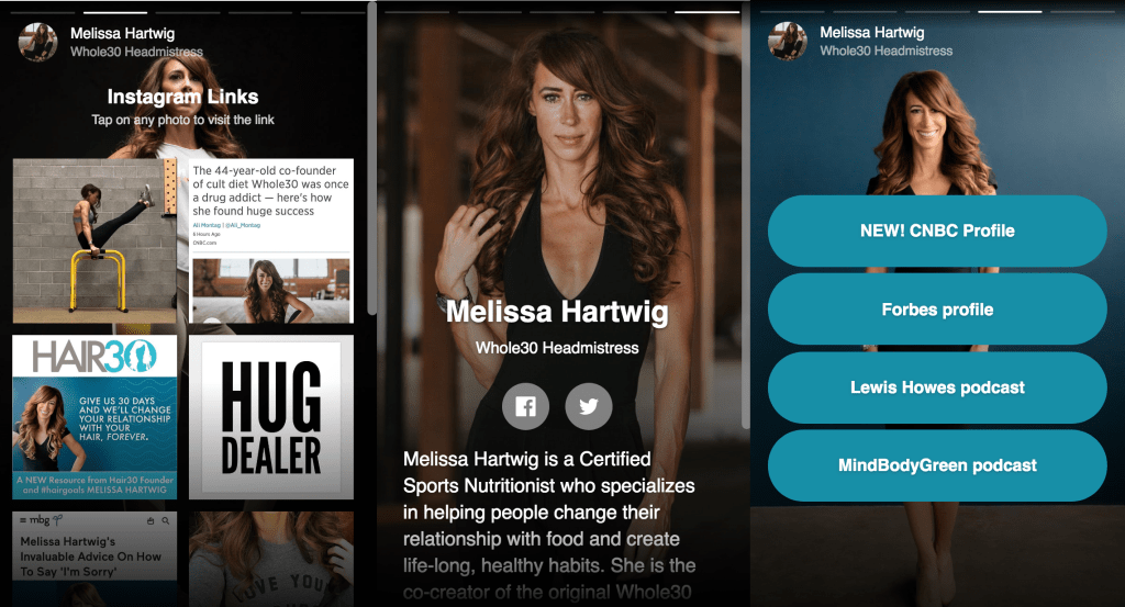 With Tap Bio, you set it as your Instagram profile link, and then create different cards to show on your mini-site. One can show two columns of your recent Instagram posts that instantly open whichever link you want to pair with each. Another offers a more visual full-screen profile with links to your other social media presences, like on Twitter and YouTube. There’s a focused, single-link call to action page if you’ve got one big thing to promote. And Tap Bio is adding more card styles.